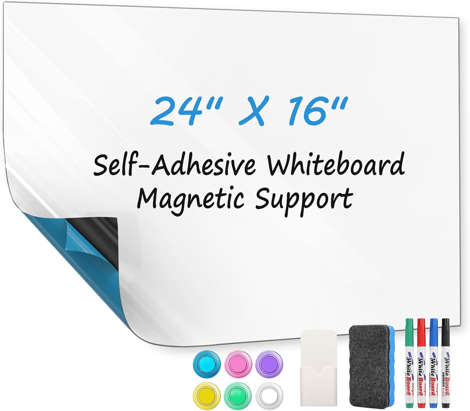 1 X dry erase board for wall(16"X24"), 4 markers, 1 piece of eraser,4 Magnets,1 Marker Holder and 1 Removable Tape.